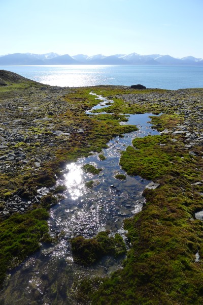 V noci trošku sprchlo, ale ráno nám počasí opět přeje. Vyrážíme těsně po osmé a asi po 40 minutách se svlékáme k prvnímu dnešnímu brodu přes řeku Vassdalselva. Není ani prudký, ani hluboký, nadále se nám potvrzuje, že letos jsme se trefili do relativně suchého roku. Blížíme se k hoře Kolfjellet. Kolem čtvrt na jedenáct nás čeká poslední dnešní, rovněž nijak náročná řeka, napájená ledovci Stenehjembreen a Kolfjellbreen. Za ní se asi hodinku čvachtáme podmáčeným terénem, pak se rozhodneme využít odlivu a sestupujeme až dolů k pobřeží. Fotím si tam zajímavou bystřinu. Přitéká z hor, stejně jako všechny její kolegyně, ale narozdíl od nich nekončí klasickým vstupem do moře, ale ponorem, přičemž veškerá její voda najednou mizí ve štěrkovém náspu.