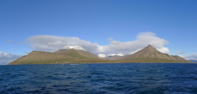 Nad městem se tyčí monumentální hora Pyramiden (939 m. n. m.). Dobytí jejího vrcholu bohužel musíme odložit na příště, do odplutí zbývá už jen chvilka času. Stačí tak akorát na to, abych si v překvapivě čisté vodě přístavní zátoky (GPS souřadnice: N78.6556; E16.3808) vylepšil svůj včerejší osobák, a vykoupal se ještě o něco severněji. Cestou na loď si fotím výzkumnou základnu Jihočeské univerzity, která má na zdejším přístavním molu deponovány dva zářivě rudé kontejnery.