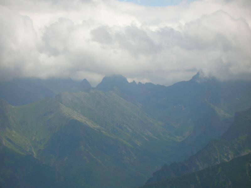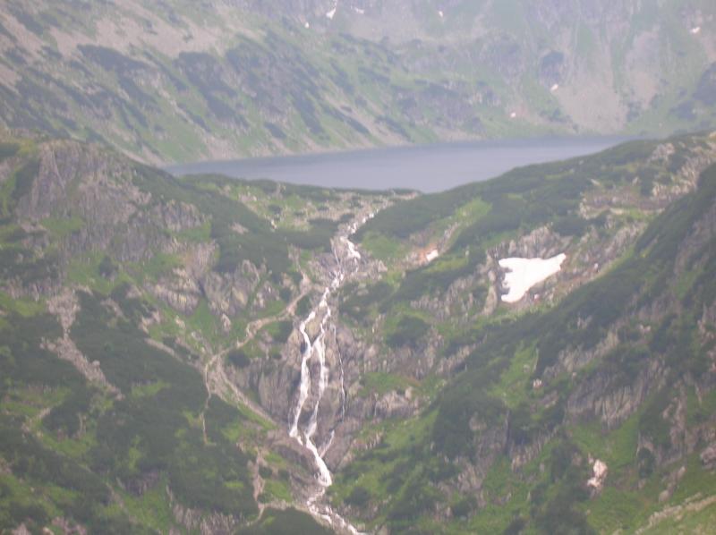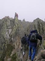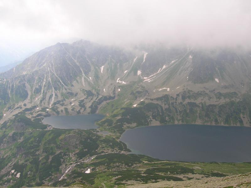 Z vrcholu padáme zpět do sedla Zawrat, začíná těžší lezení. Sestupujeme na opačnou stranu hřebene s výhledem na Ciarny staw s ostrůvkem uprostřed plesa. Mílovi v traverzu podklouzly nohy, sletěl pár metrů, naštěstí se chytil ocelového lana. Já raději vlhký travers podešel bezpečnější cestou která vedla hned pod ním. Cesta se klikatí z jedné strany hřebene na druhou, za chvíli ztrácím přehled odkud jsme vyrazili a kam míříme. Orientaci ztěžují i houstnoucí mraky. Milan si vybírá další smolnou chvilku. Prvolezec nedával pozor a shodil dolů šutr, který se rozštípnul o skálu. První část těsně minula Mílovu hlavu, ale druhý kus jej trefil do kolena. Za sucha by ferrata byla asi naprosto pohodová, jenže když mrholí, jsou i naprosto pohodové sestupy o hubu. A některé převisy jsou občas náročné jak fyzicky, tak psychicky.