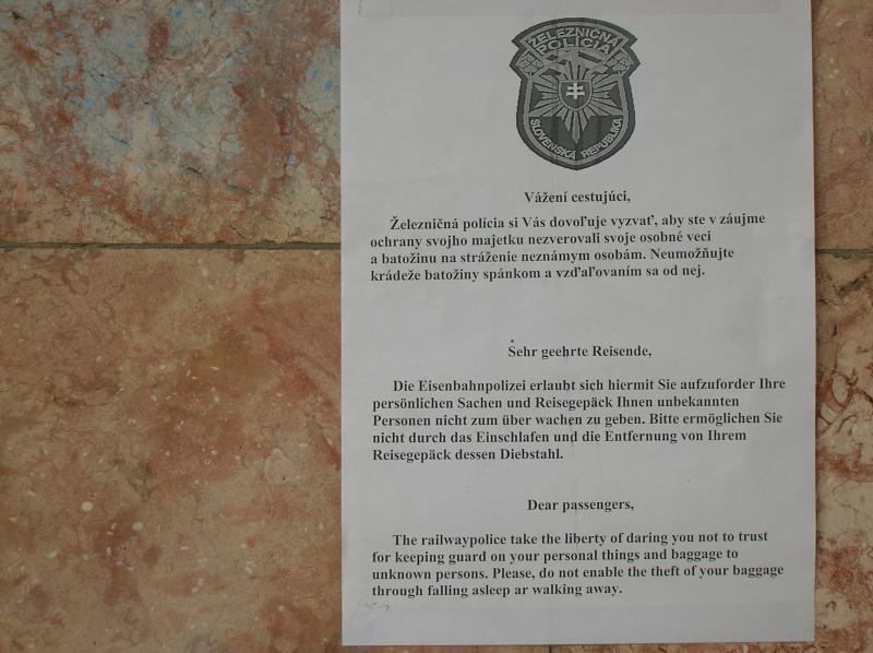 Ani okolí nádražní budovy neposkytovalo moc možností posnídat, i na Slovensku slaví Cyrila a Metoděje, naštěstí jsme si dovezli vlastní zásoby. Ale místní obyvatelstvo je k turistům natolik pozorné, že se o tom zmiňují i policejní cedule:
