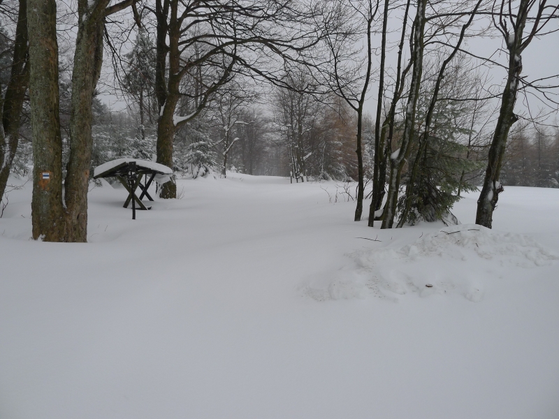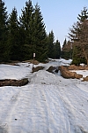 posypanou a nesjízdnou příjezdovou cestu ke střelnici a pokračoval dolů až k rozcestí nad Schwartzer Teich. Tam jsem se několik hodin trápil v hlubočáku