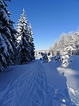na sjezdovku jelo zhruba stejně. Původní plán dojet až na Dlouhou Louku nevyšel, ráno v devět ještě tu trasu nestihli projet (dodělali to během dne), tak jsme si zakroužili po zdejších okruzích. Vystartovali jsme do mlhy, která se ale záhy rozplynula a my si užívali kýčovitě zimní svezení a ještě prvenství ve stopě :-). Přestože rolba stopu projela již několikrát, lyže se do prašanu dost zabořovaly. Lyže i hůlky vrzaly, sklouznutí bylo zejména v kopcích nutno pořádně podpořit rukama. Mezi pátým a šestým okruhem nám stopu přehradil středně velký smrček. Za naprostého bezvětří, asi už ho to prostě přestalo bavit, nebo si nás chtěl prohlédnout víc zblízka :-). Po tréninku jsme zaskočili do hospody hned vedle dojezdu na parkoviště. Měli několik druhů polévek, hotovky atp. | ||||||||||||||||||||||||||||||||||||||||||||||||||||||||||||||||||||||||