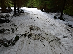 neprojedeš, vytátá byla i cesta těsně za ním. A v lese pro změnu jehličí. Na sluníčku to moc nejelo, ale na spoustě míst se zrnitým sněhem naopak